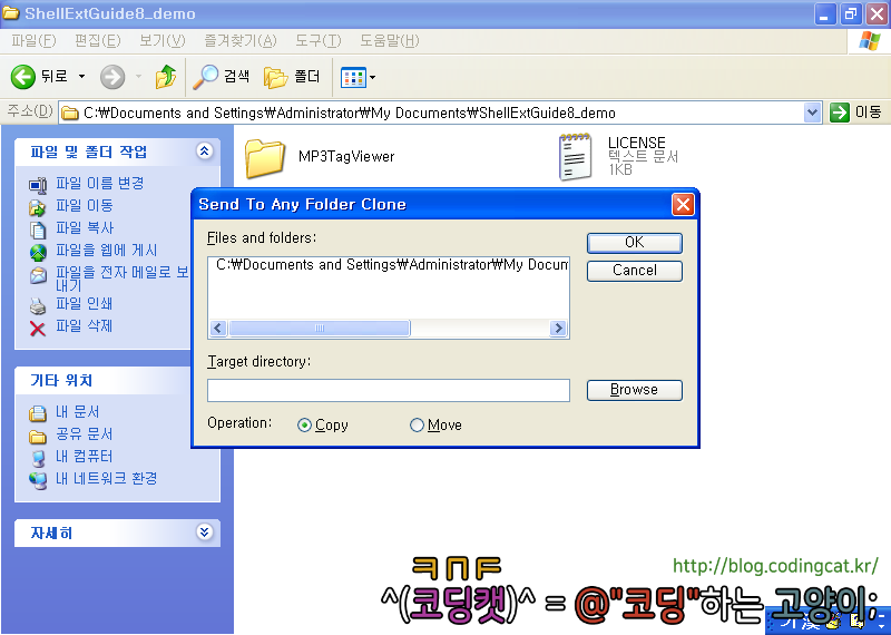 딱히 복잡하지 않은 MFC 다이얼로그입니다. 이에 대한 소스 코드는 SendToCloneDlg.cpp에서 보실 수 있습니다. 필자는 이미 “CShellFileOp - SHFileOperation의 래퍼 클래스”라는 게시글을 통해 CShellFileOp 클래스를 소개한 바 있고, 이를 사용하여 실제로 파일을 옮기거나 복사하였습니다.