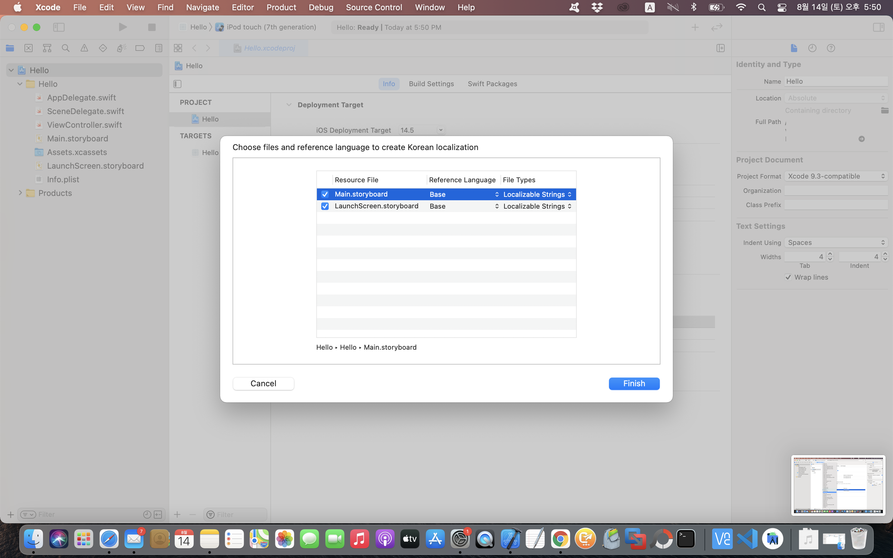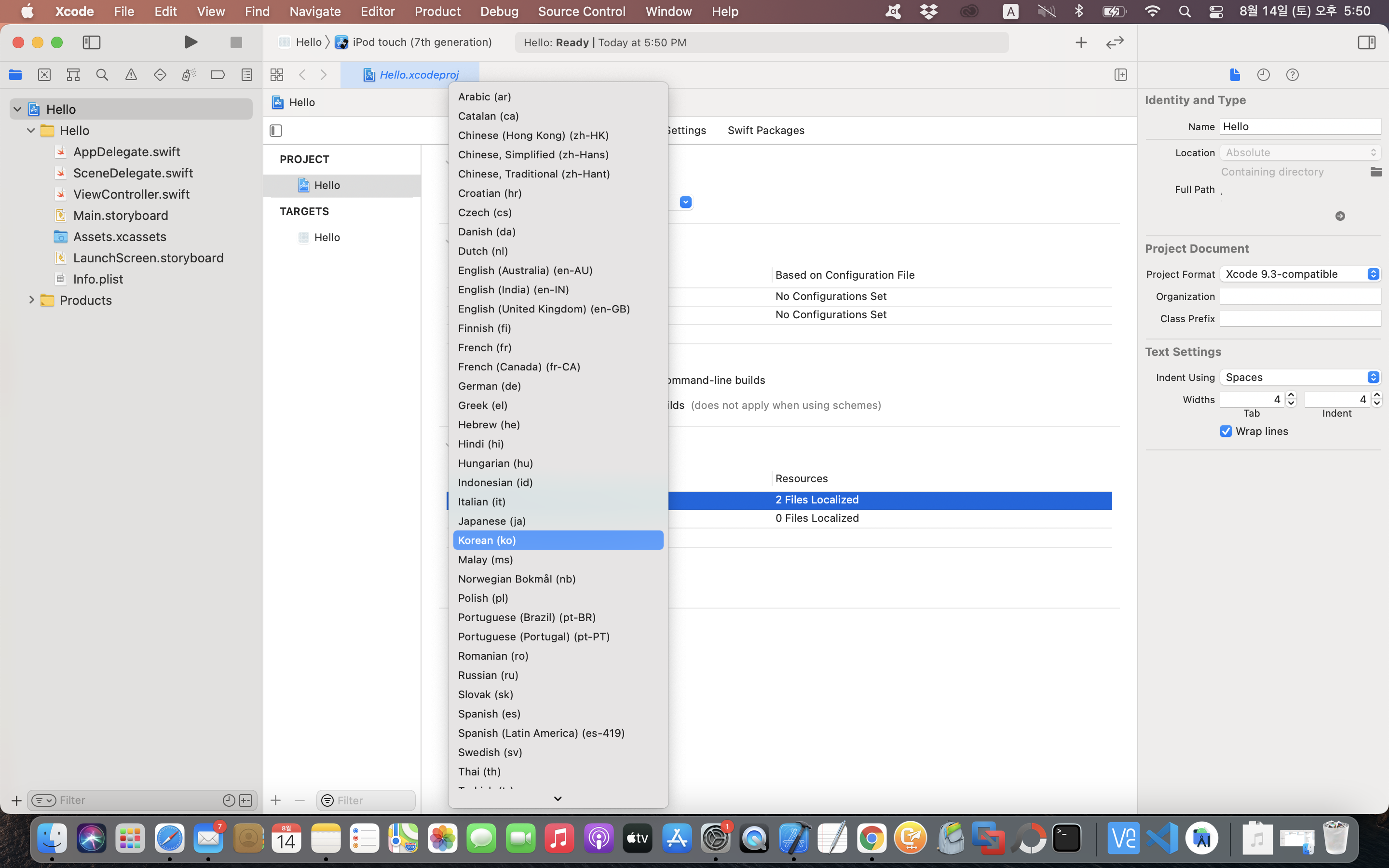 Localization 항목을 보면 기본으로 영어만 추가되어 있는데, [+] 버튼을 눌러 앱이 지원할 수 있는 언어들을 하나씩 클릭하여 추가시킨다.