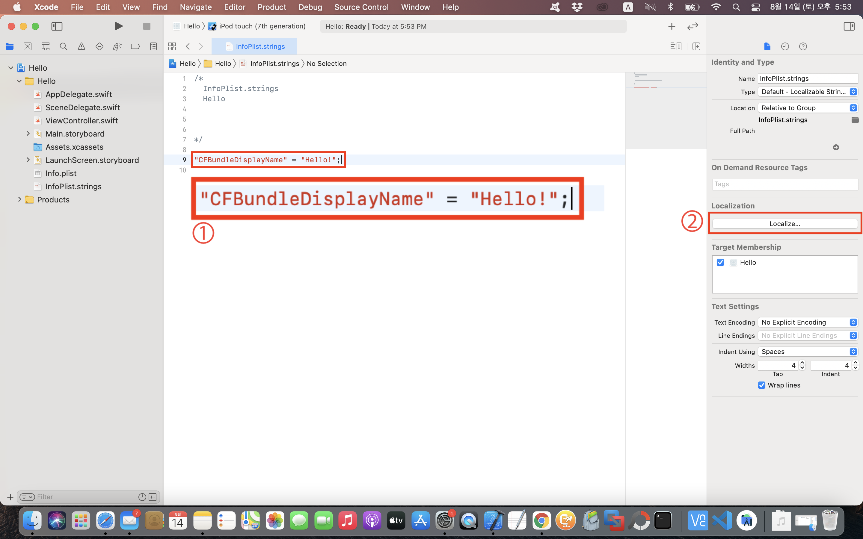 iPhone 또는 iPad의 언어 설정에 따라 홈 화면에 나타나는 앱의 이름을 다르게 보여주어야 할 필요가 발생할 수 있다. 예를 들어 카카오톡의 경우도 한국어 상태의 단말기에서는 홈 화면에서 앱 이름이 “카카오톡”과 같이 한글로 나타나지만, 영어 상태의 단말기에서는 앱 이름이 “KakaoTalk”과 같이 영문으로 나타난다. 사용자에게 나타나는 앱의 이름은 CFBundleDisplayName이라는 이름으로 번들(bundle)에 보관되게 된다.