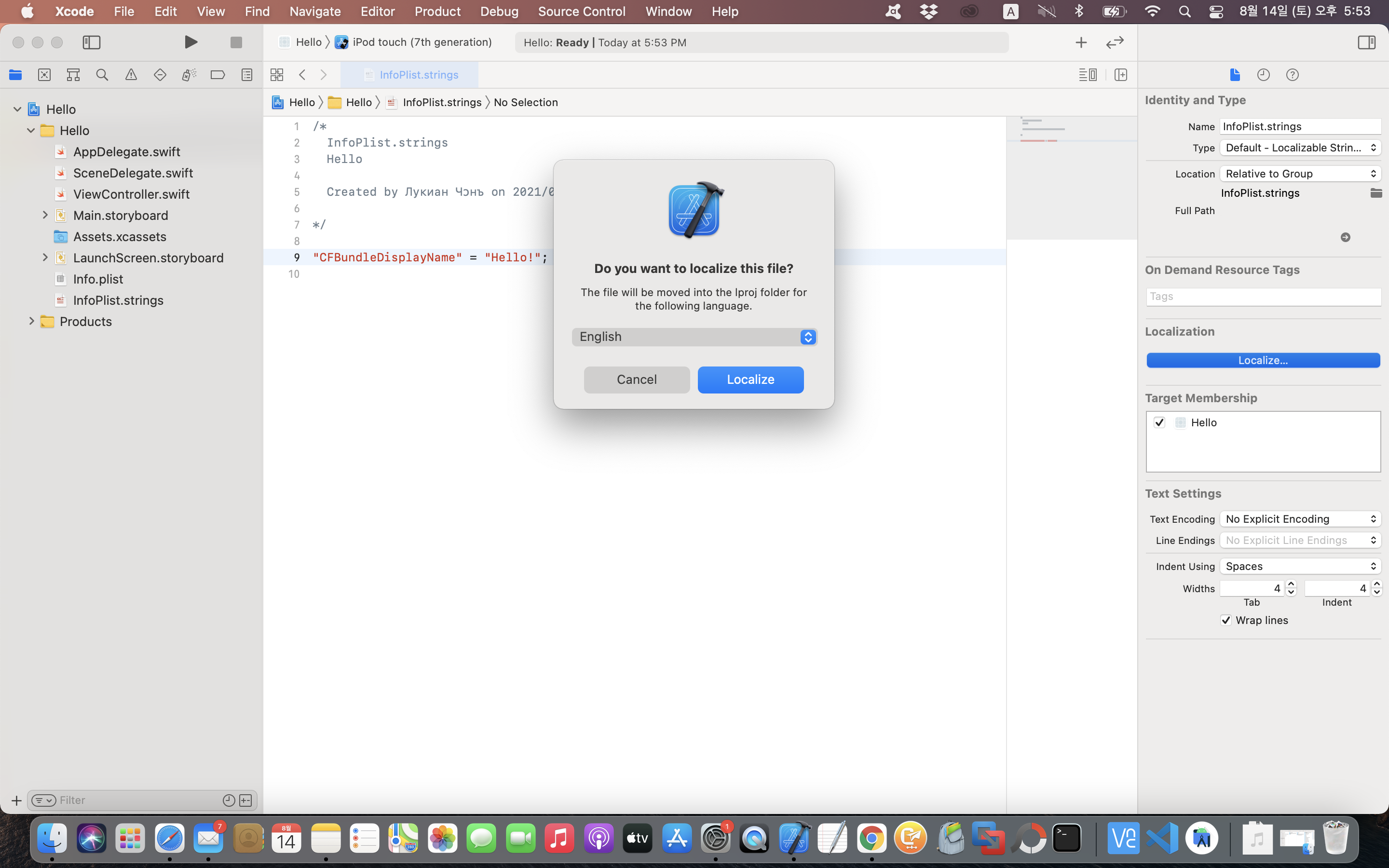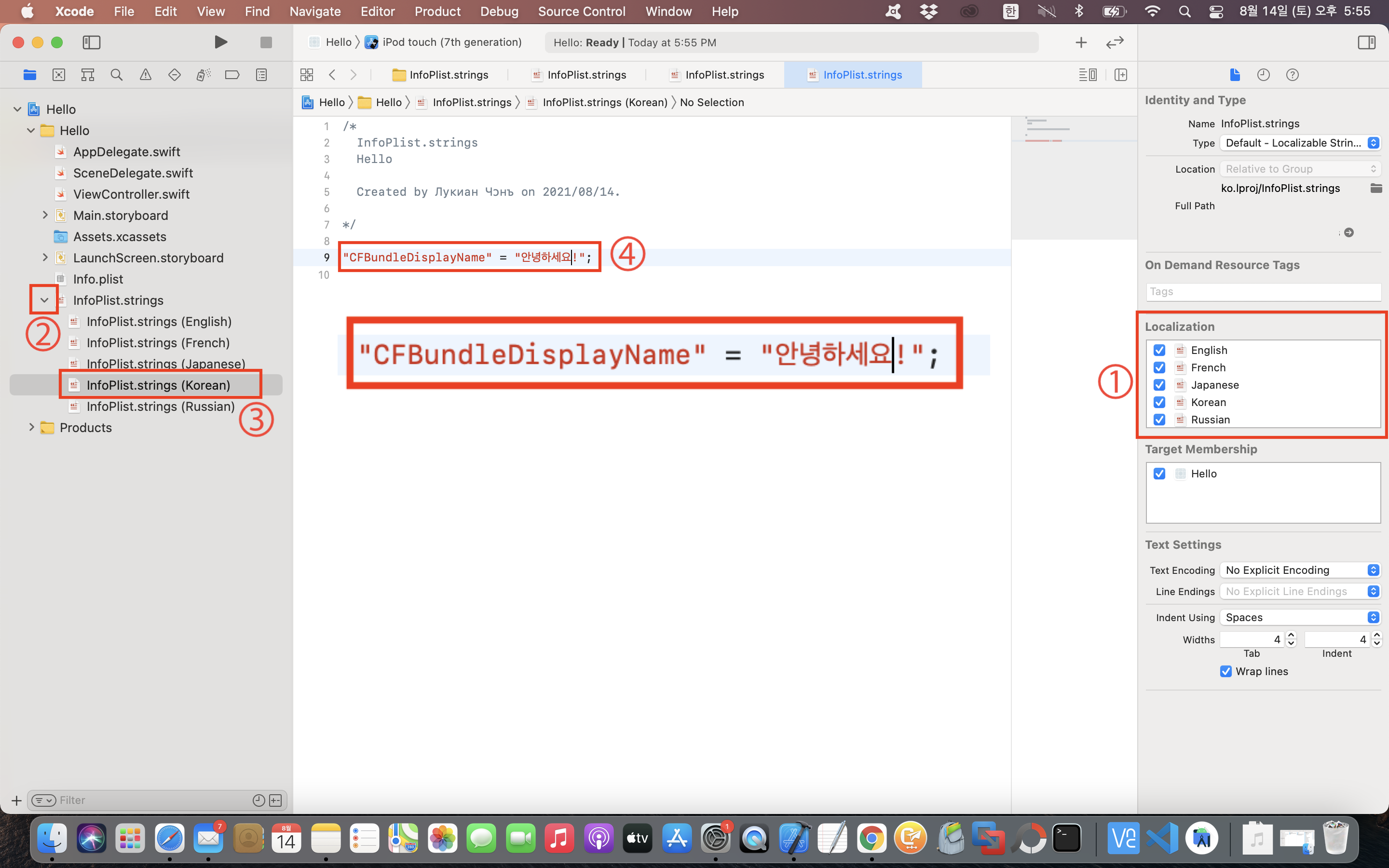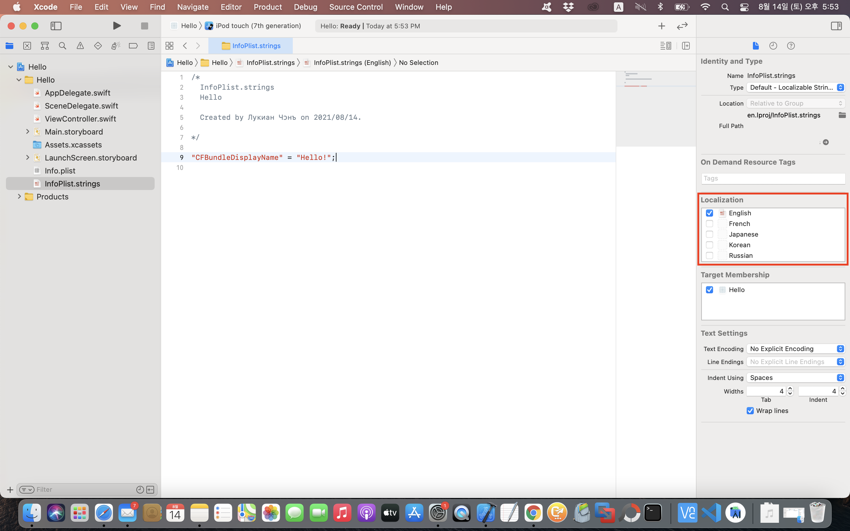 언어를 체크할 때마다 프로젝트 내비게이터(Project navigator)에서 InfoPlist.string가 해당 언어 버전으로 분화되는 것을 볼 수 있다. 파일을 하나씩 열어서 그 언어에 맞게 앱 이름을 적어준다. 그러면 단말기의 언어 설정에 따라 앱 이름이 다르게 나타날 것이다.