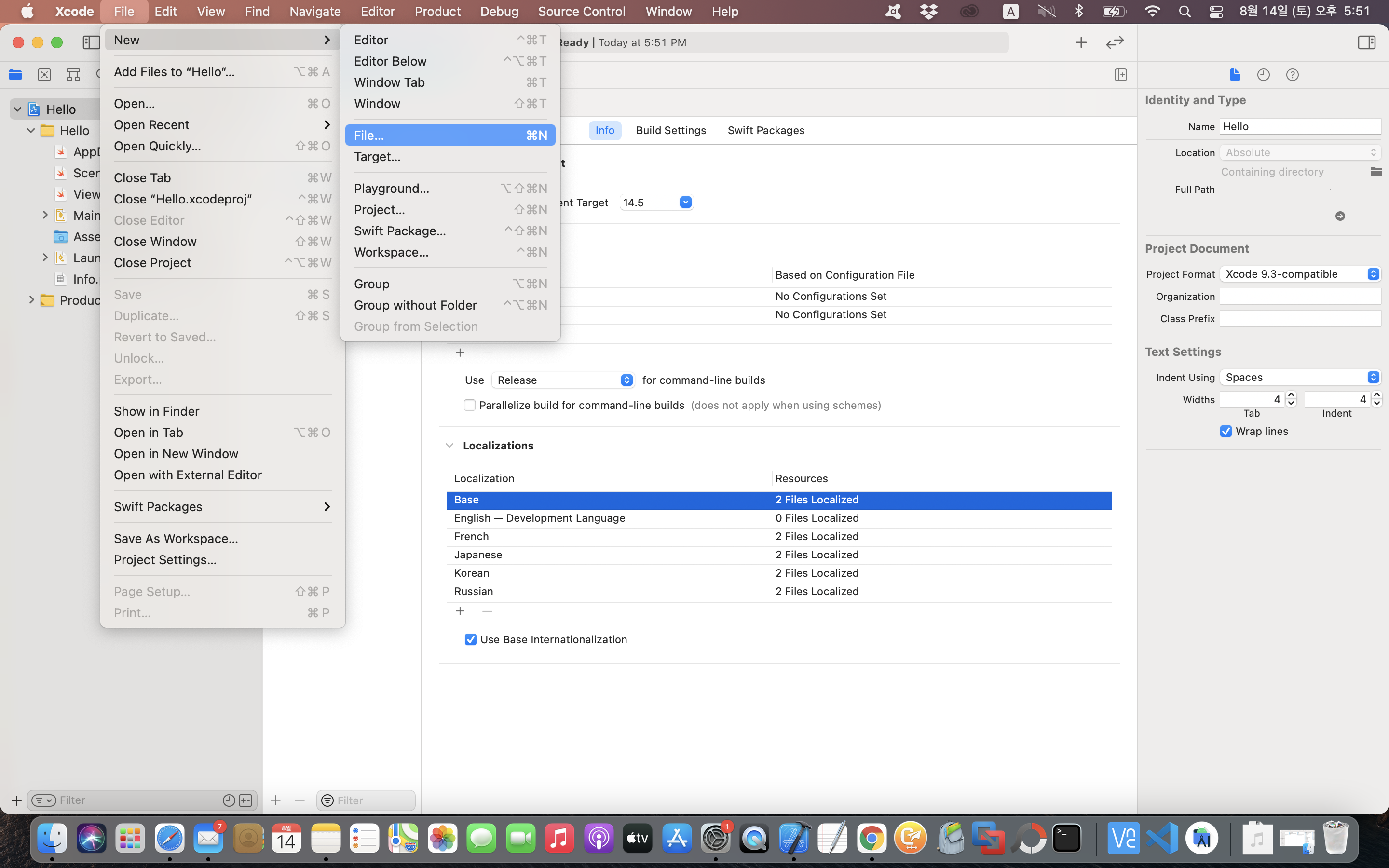 1 단계에서 앱이 지원할 수 있는 언어들을 결정한 후에 [File] 메뉴에서 새 파일을 추가한다.