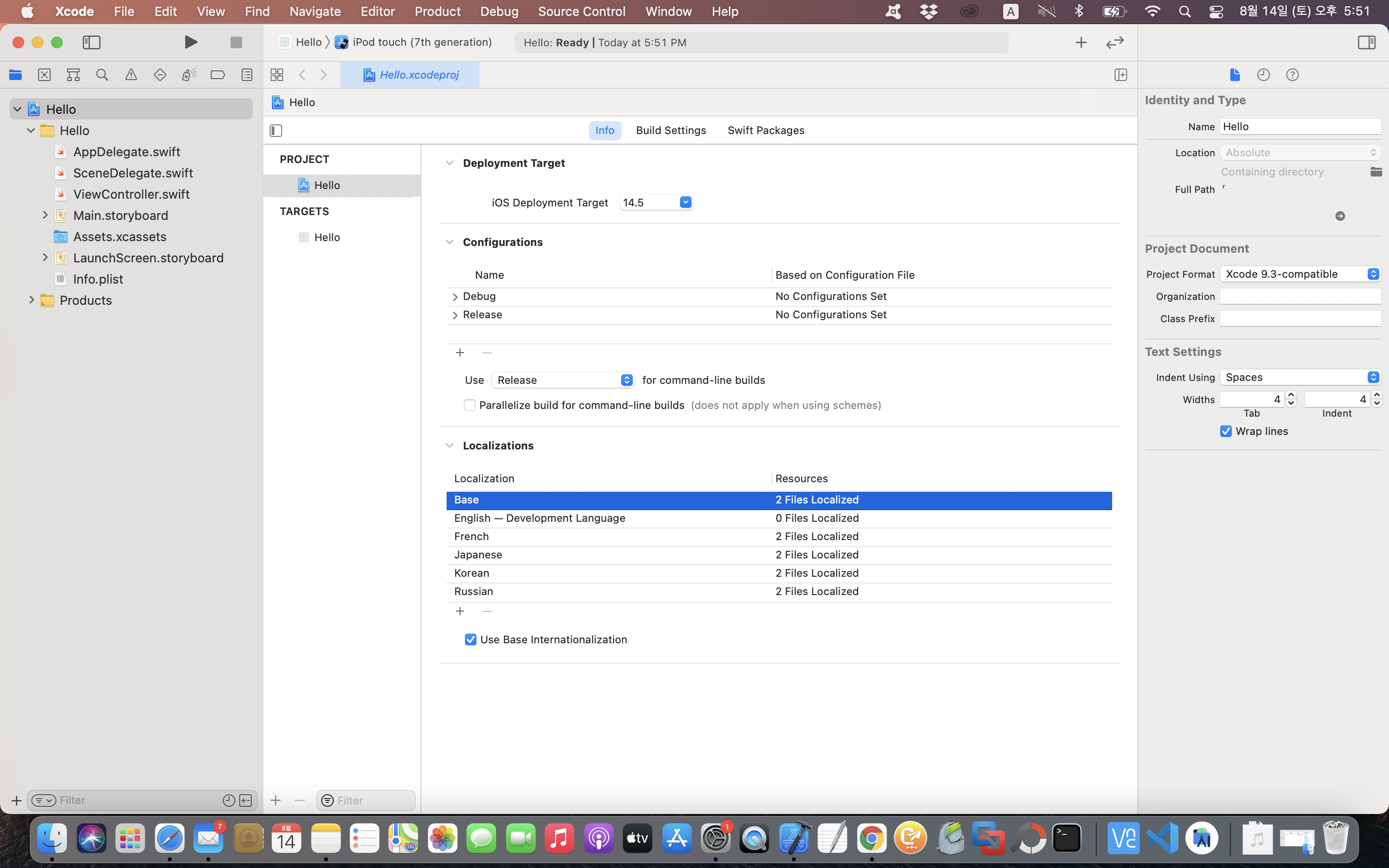 Xcode의 좌측 프로젝트 내비게이터(Project navigator)에서 최상단 항목인 프로젝트를 선택한다. 그 다음 우측 편집 화면에서 프로젝트 이름을 선택한 후 [Info] 탭을 클릭한다.