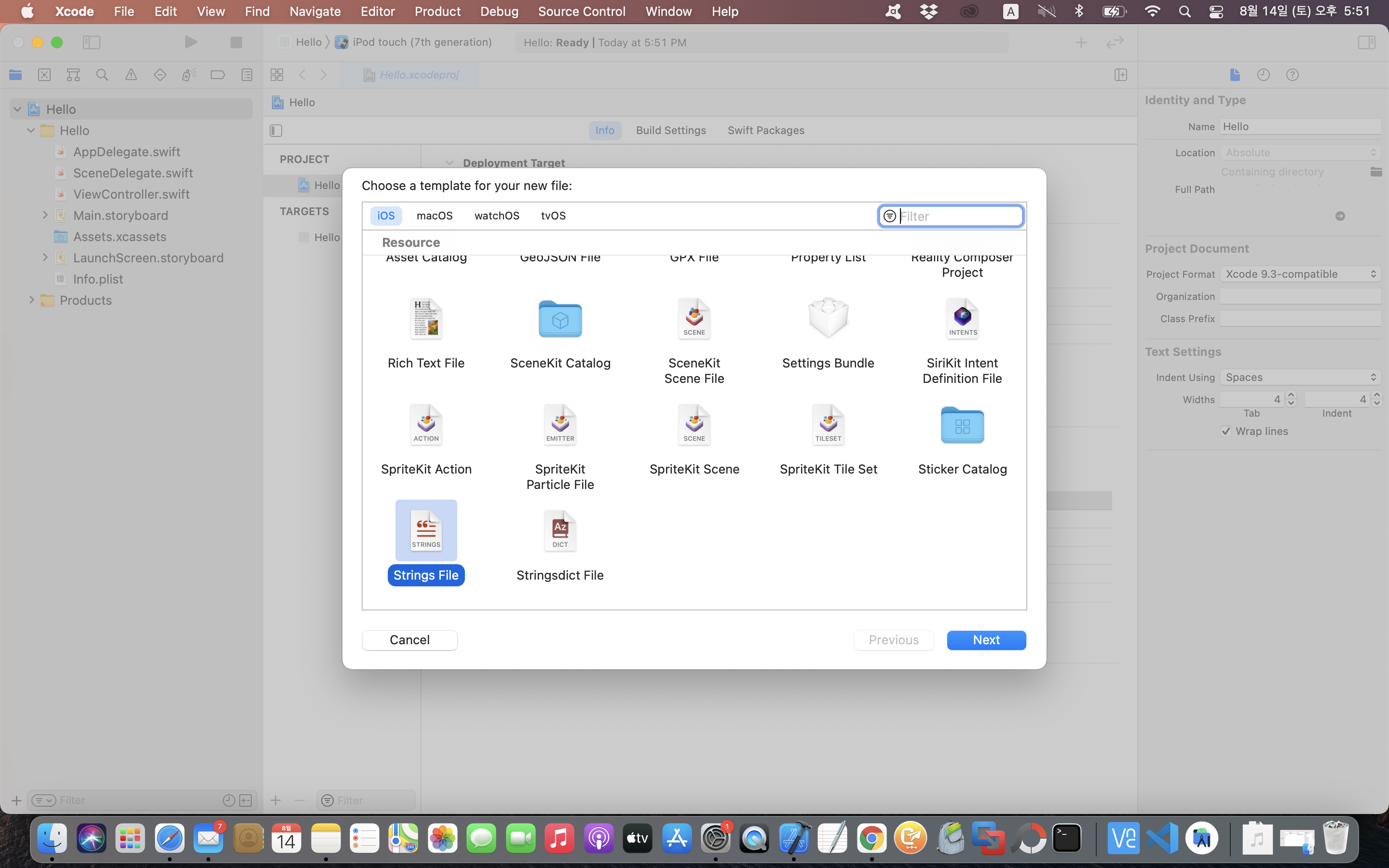 또한 파일의 이름은 InfoPlist.strings이므로 대화상자에는 InfoPlist를 입력한다. 파일 이름은 바꾸거나 할 수 없고, Xcode에서 항상 그렇게만 쓰겠다고 고정시킨 이름이기에 여기에 따른다.