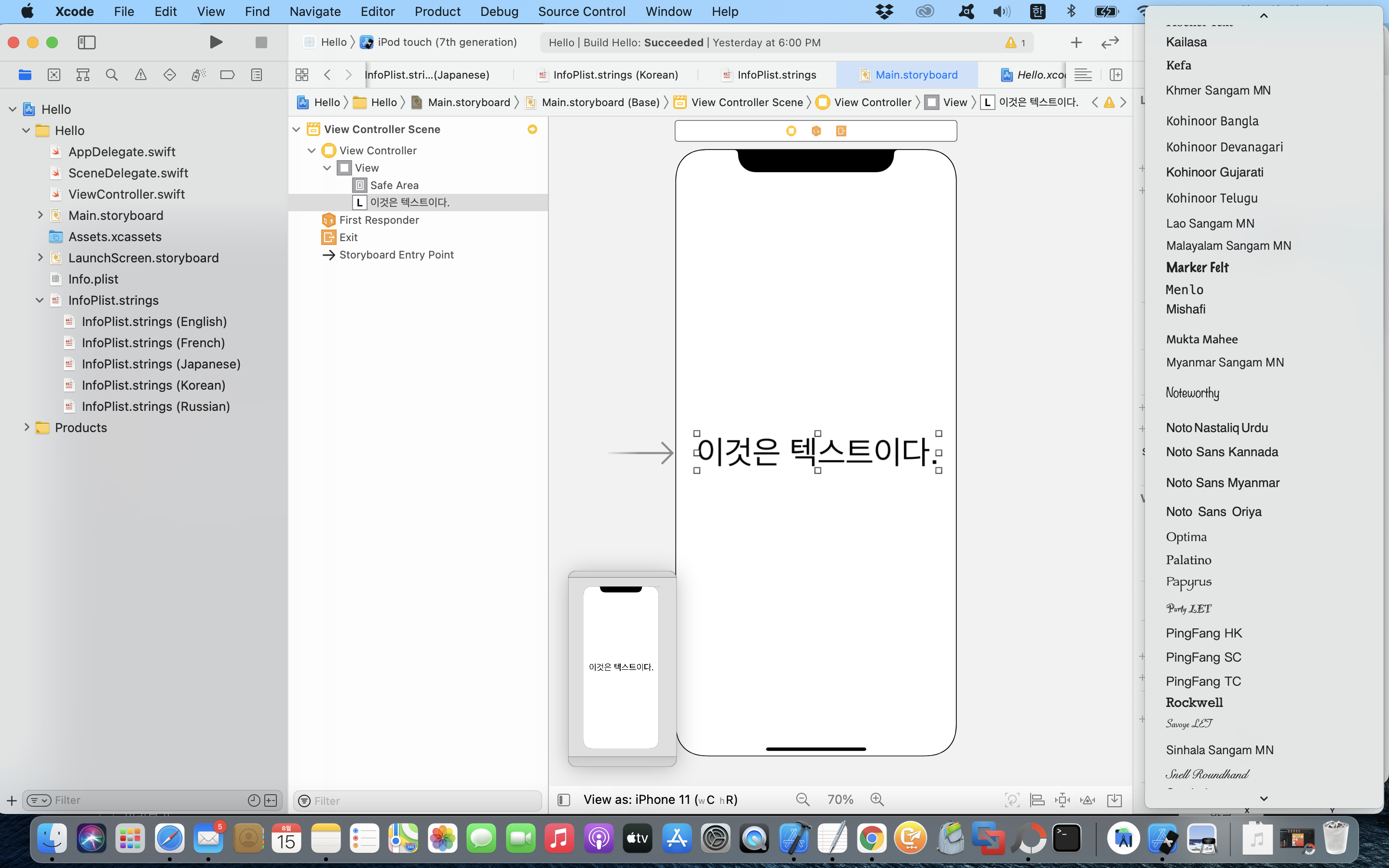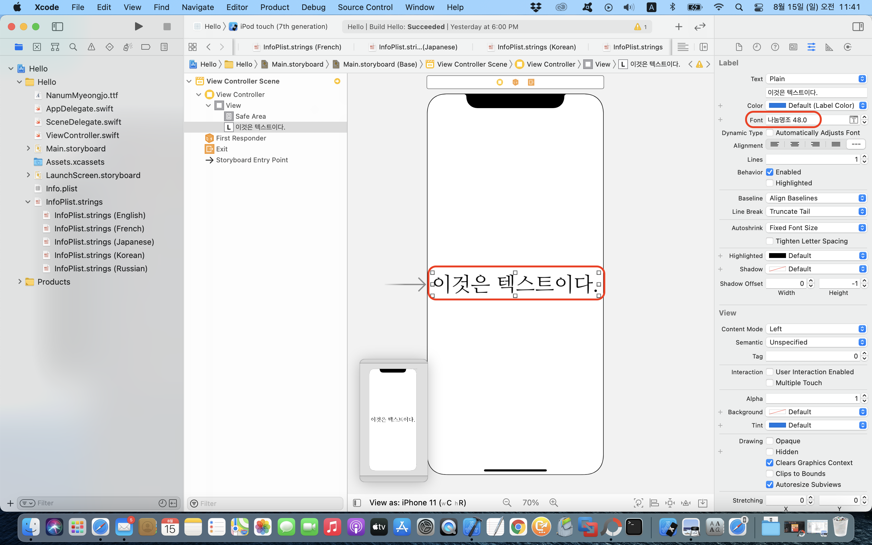 전・후 비교를 확실하게 보기 위하여 일단 스토리보드에 적당한 텍스트를 추가한다. 시스템 폰트가 적용되어 있고, 폰트 목록에도 아직 커스텀 폰트가 나타나지 않는다.