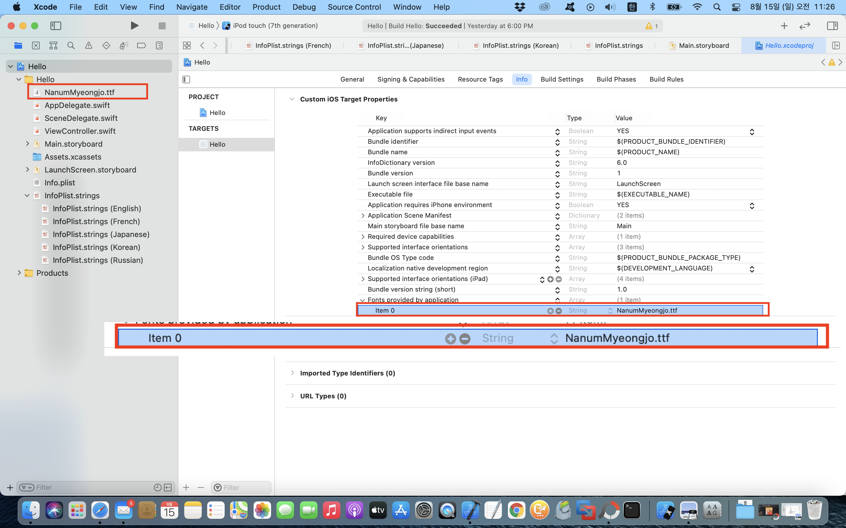 앱에 폰트가 추가되었음을 번들(bundle) 차원에서 알고 있어야 한다. 이를 위해 ① 프로젝트 내비게이터(Project navigator) - ② 최상단 항목 - ③ TARGET에서 해당 항목을 선택한 후 ④ Info 탭을 클릭한다. Custom iOS Target Properties에서 ⑤ [+] 모양의 버튼을 클릭하여 ⑥ "Fonts provided by application"이라는 이름이 붙은 변수를 새로 추가한다.