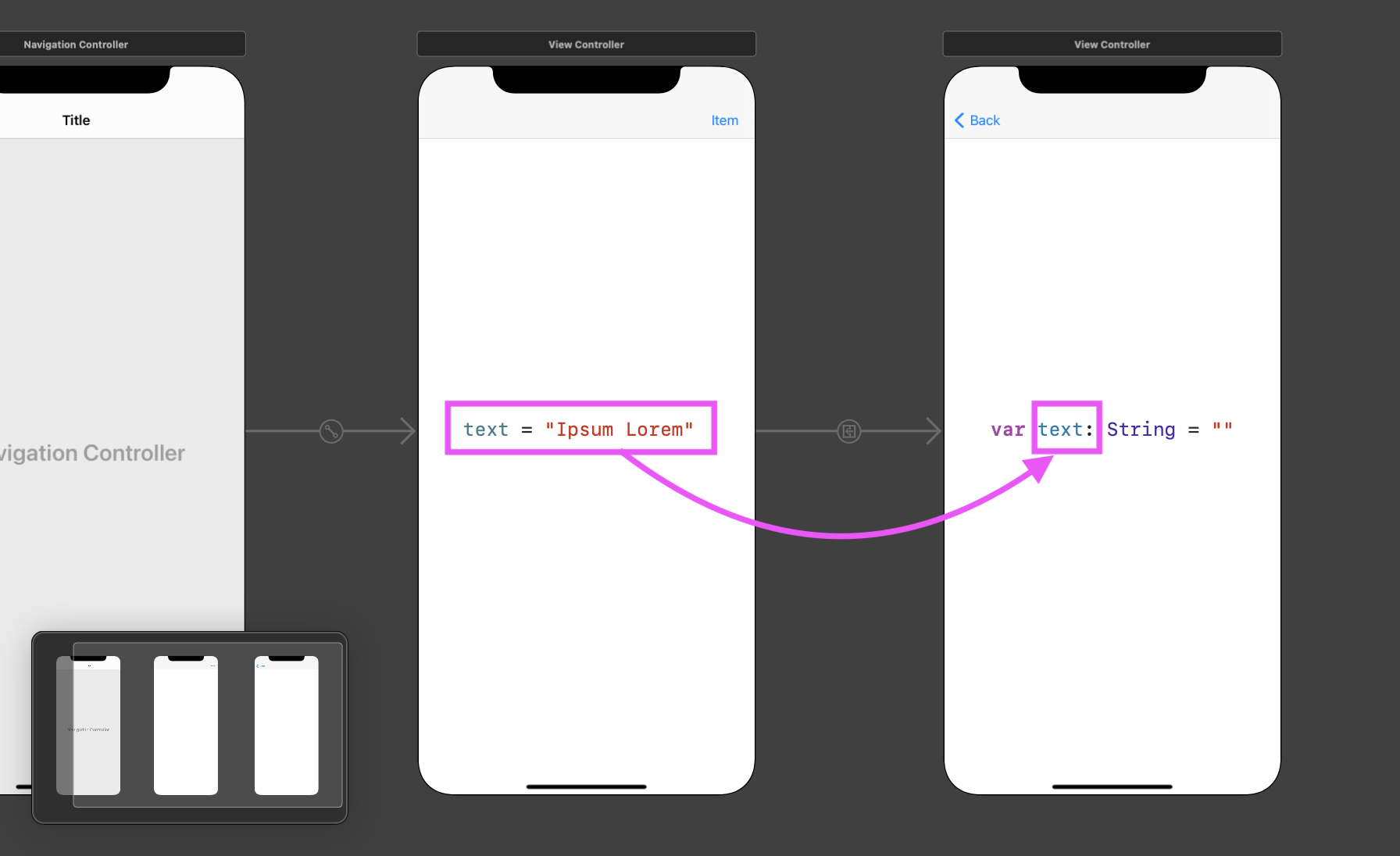 그 다음 secondaryViewController의 text 프로퍼티에 문자열을 대입합니다. 이 때가 뷰 컨트롤러 사이에 실질적으로 데이터를 교환하는 순간입니다!