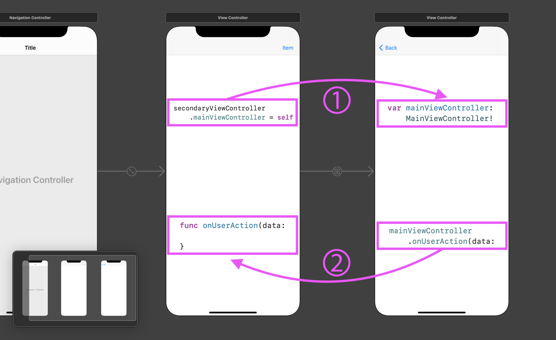 위의 예제에서 보듯 mainViewController라는 프로퍼티에 self가 대입됩니다. 이로써 나중에 등장할 뷰 컨트롤러는 자신을 호출해 준 뷰 컨트롤러의 존재를 알고 있습니다. 때문에 나중에 등장할 뷰 컨트롤러는 onUserAction(data:)와 같이 해당 뷰 컨트롤러의 메소드(함수)들을 호출할 수 있습니다.