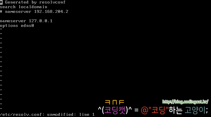 그리고나서 vi로 /etc/resolv.conf를 수정한다. 127.0.0.1를 참조하는 라인을 삭제하고, 공유기 아이피 주소에 붙은 주석을 해제한다.