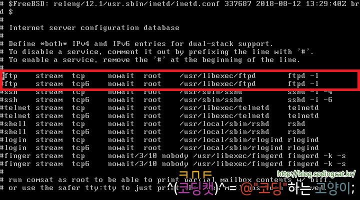그 다음 rc.conf를 열어 inetd를 사용 가능하게 수정 후 이를 실행한다.