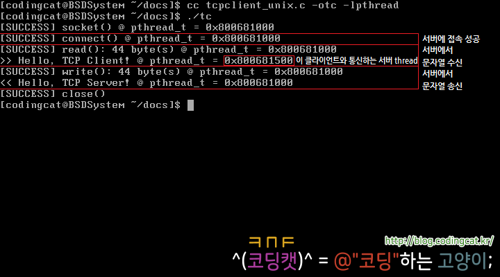 위 소스 코드를 FreeBSD에서는 다음과 같이 컴파일한 후 실행할 수 있다.