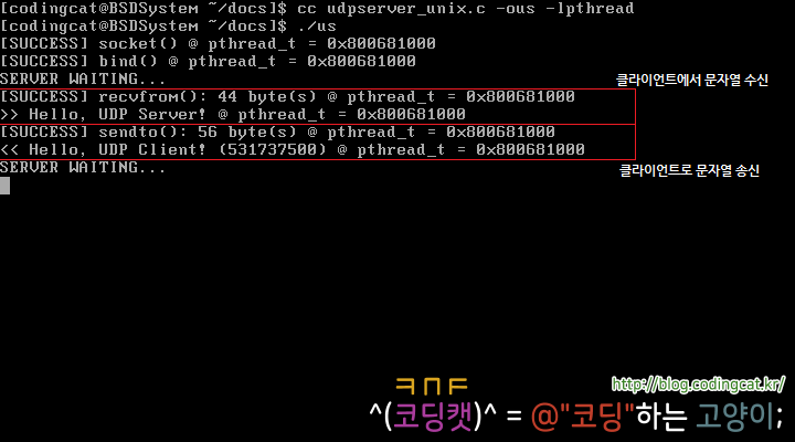 위 소스 코드를 FreeBSD에서는 다음과 같이 컴파일한 후 실행할 수 있다.