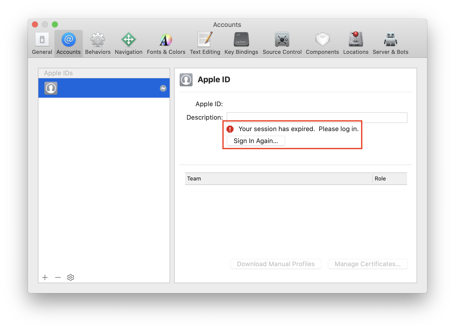 [Accounts]를 클릭하면 해당 Apple ID가 세션 만료된 것을 확인할 수 있다. 새로운 암호로 로그인하면 해결 완료.