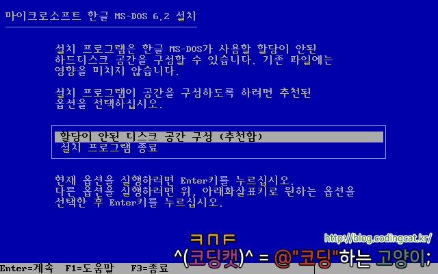 설치 프로그램은 한글 MS-DOS가 사용할 할당이 안된 하드디스크 공간을 구성할 수 있습니다. 기존 파일에는