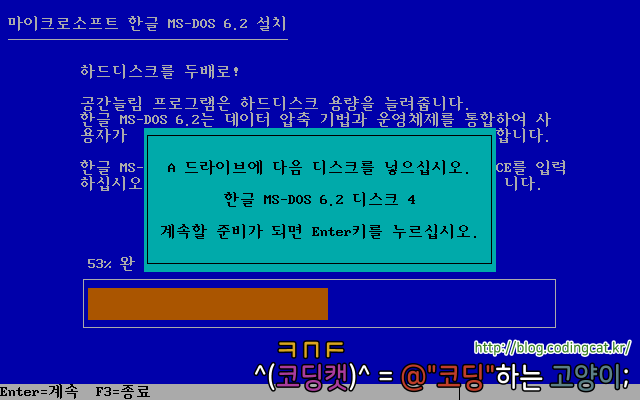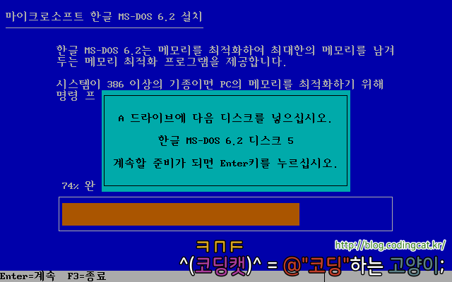 계속하여 '다음 디스크'를 넣어주면서 Enter키를 누른다. 간혹 나오는 홍보문구들이 당시의 컴퓨터 환경을 잘 말해주는듯 하다. 무엇보다도 하드 용량과 램 용량 확보에 사활을 걸었던 시대였다.