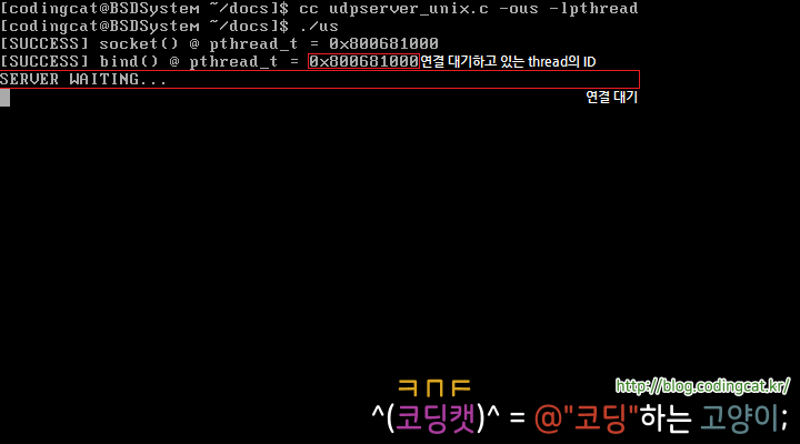 ID가 0x800681000인 thread가 무한루프를 돌리며 접속을 기다리다가 클라이언트로부터 접속이 발생하면 새 thread를 생성되면서 해당 클라이언트와 통신하게 된다. 여기서는 0x800681000로부터 0x800681500가 파생되고, 0x800681500를 통해 클라이언트가 통신한다. 이 과정은 다음과 같이 화면으로 출력된다.
