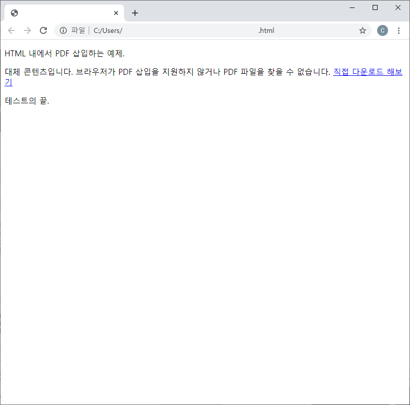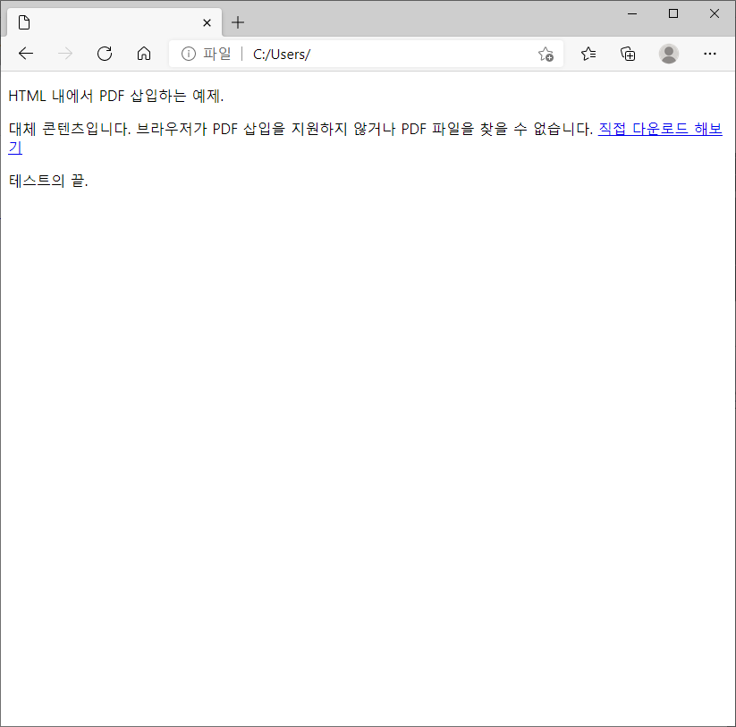 만일 대체 콘텐츠를 보이기 원치 않고 반드시 PDF가 삽입된 결과를 얻고자 하면 object 태그 안에 embed 태그로 같은 내용을 한 번 더 적어주면 된다. object 태그를 지원하지 않는 브라우저는 그 안에 담긴 embed 태그를 읽어서 PDF를 표시해 줄 것이다. 다만 HTML5의 기준에서 어차피 둘 다 표준이기 때문에 이렇게 적는 것이 그리 큰 의미가 있을지는 의문이다.