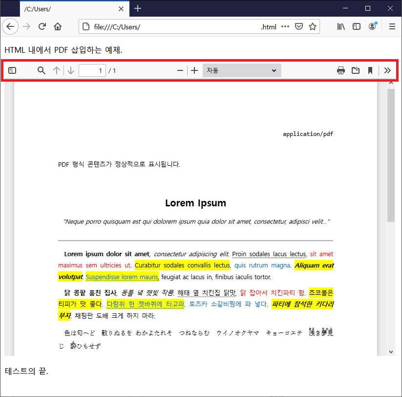 먼저 object 태그를 통해 다음과 같이 PDF 파일을 삽입할 수 있다. embed와 마찬가지로 MIME type과 URI를 지정하면 된다. 구 버전 HTML에서는 clsid라는 속성(attribute)으로 PC에서 특정 플러그인을 불러올 수 있고, 해당 플러그인이 없을 때는 codebase라는 속성(attribute)으로 그 플러그인을 다운로드할 주소를 지정했다. 다름아닌 ActiveX Control을 불러오는 기능이기에 HTML5에서는 이 속성이 폐지(deprecated)되었다. 즉 사용하면 안 된다.