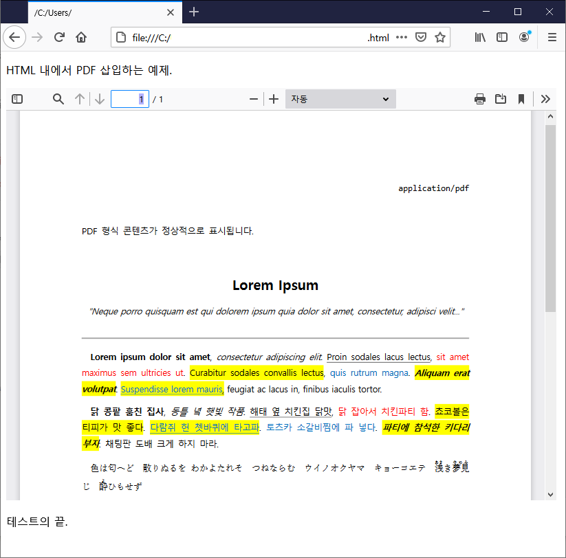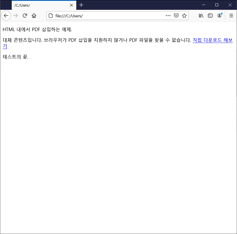 만일 대체 콘텐츠를 보이기 원치 않고 반드시 PDF가 삽입된 결과를 얻고자 하면 object 태그 안에 embed 태그로 같은 내용을 한 번 더 적어주면 된다. object 태그를 지원하지 않는 브라우저는 그 안에 담긴 embed 태그를 읽어서 PDF를 표시해 줄 것이다. 다만 HTML5의 기준에서 어차피 둘 다 표준이기 때문에 이렇게 적는 것이 그리 큰 의미가 있을지는 의문이다.