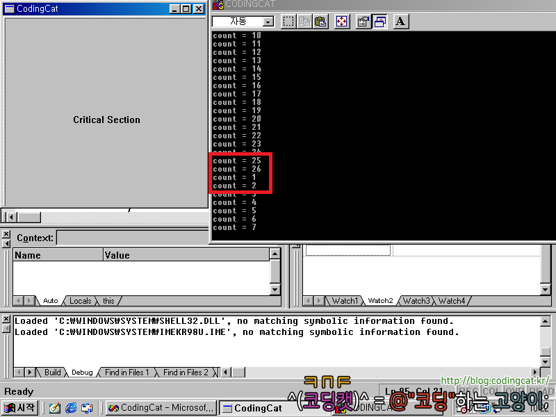 다음은 크리티컬 섹션의 실행 예이다. 창에 대한 스레드, 콘솔창에 대한 스레드 총 2개의 스레드가 실행중이며 콘솔창으로 1부터 30까지 센 후 콘솔창은 닫힌다. 창의 버튼을 클릭하면 콘솔창에서 세고 있는 숫자는 1로 리셋된다. 이 과정에서 크리티컬 섹션이 사용된다.