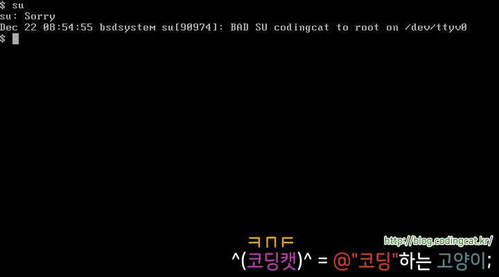 su명령은 일반 계정에서 루트 계정의 Shell을 띄울 때 사용하는 명령이다. FreeBSD에서는 일반 계정에서 su를 사용하고자 할 때, 다음과 같이 Sorry 메시지를 띄우며 루트 계정으로의 진입을 거부한다.